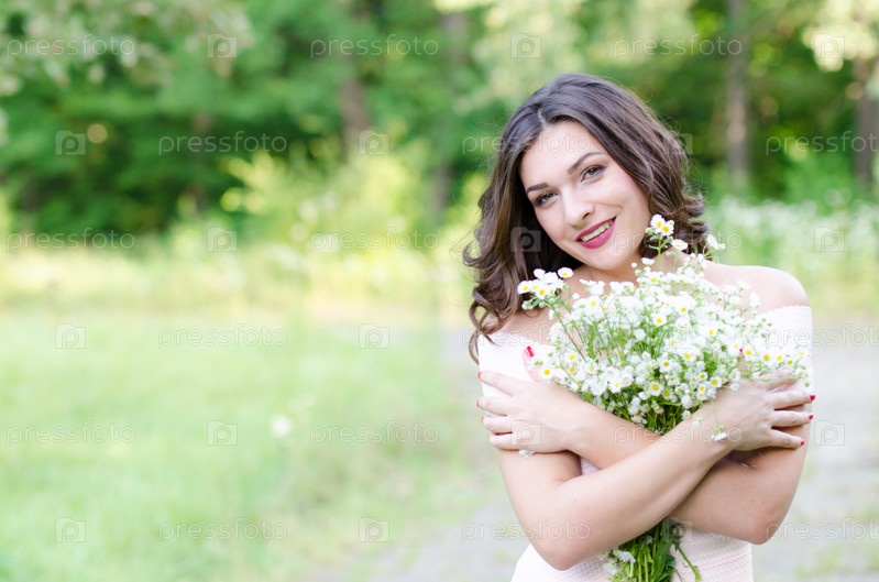 Портрет красивой молодой девушки с букетом цветов