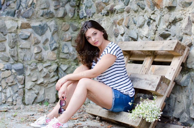 Портрет красивой молодой девушки у каменной стены