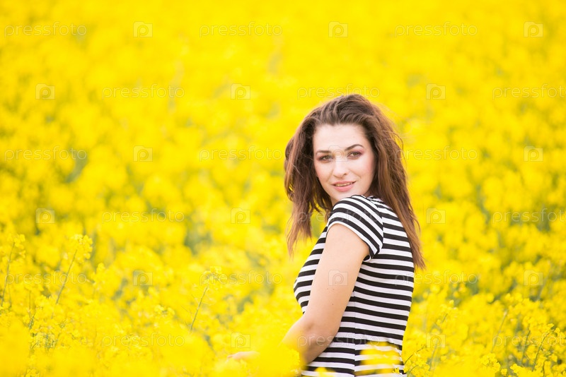 Портрет красивой молодой девушки в поле рапса