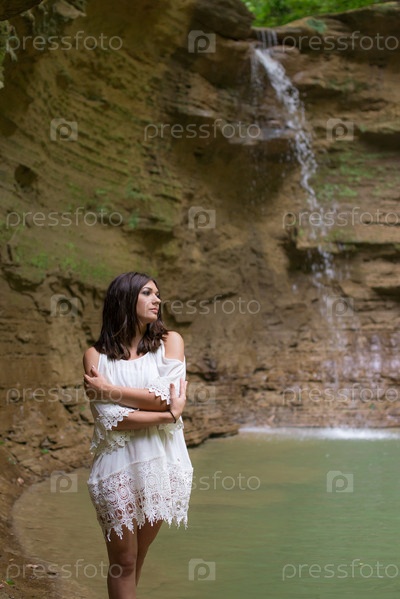 Красивая стройная девушка возле горного водопада