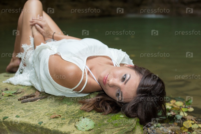 Красивая стройная девушка возле горного водопада