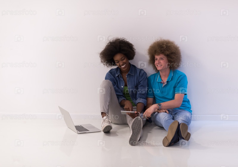 Многонациональная пара сидит на полу с ноутбуком и планшетом