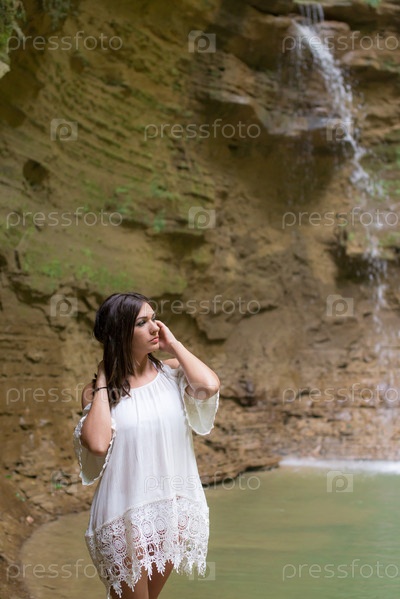 Красивая стройная девушка возле горного водопада