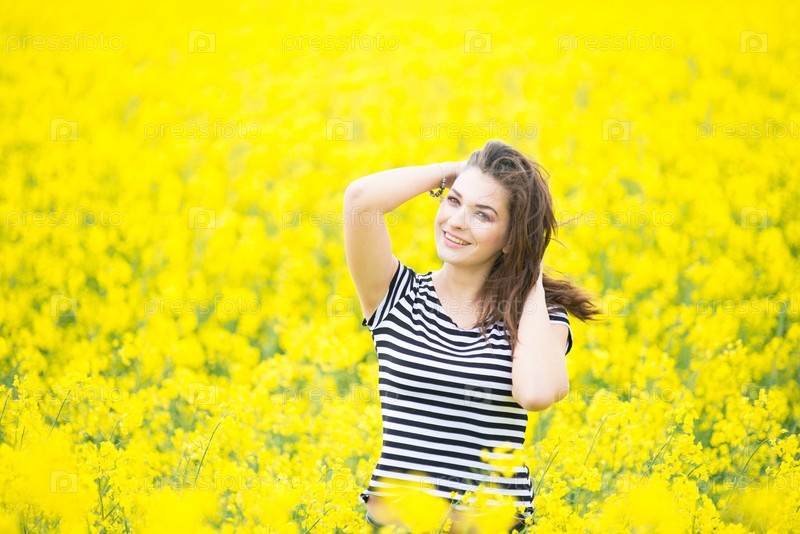 Портрет красивой молодой девушки в поле рапса
