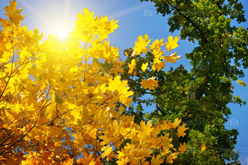 Ветви деревьев и желтые осенние листья на фоне голубого неба и солнца