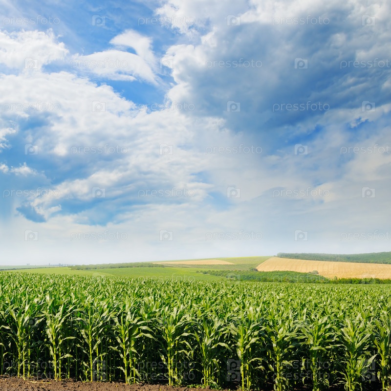 Зеленое поле кукурузы и голубое небо