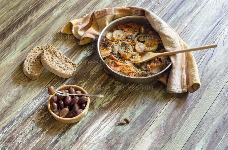 Рагу из овощей, оливок и сухариков на деревянном столе