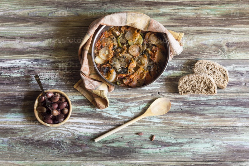 Рагу из овощей, оливок и сухариков на деревянном столе