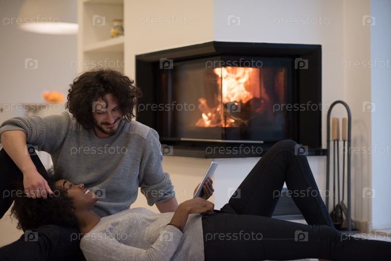 Многонациональная пара лежит на полу перед камином