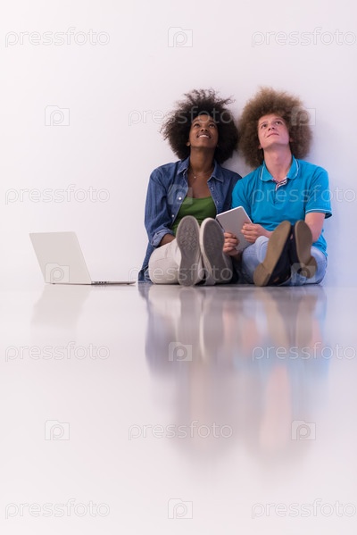 Многонациональная пара сидит на полу с ноутбуком и планшетом