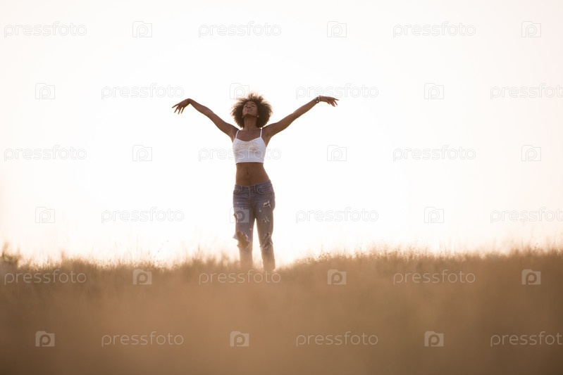 Молодая чернокожая девушка танцует на лугу