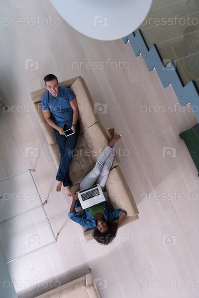 Молодая многонациональная пара отдыхает в гостиной