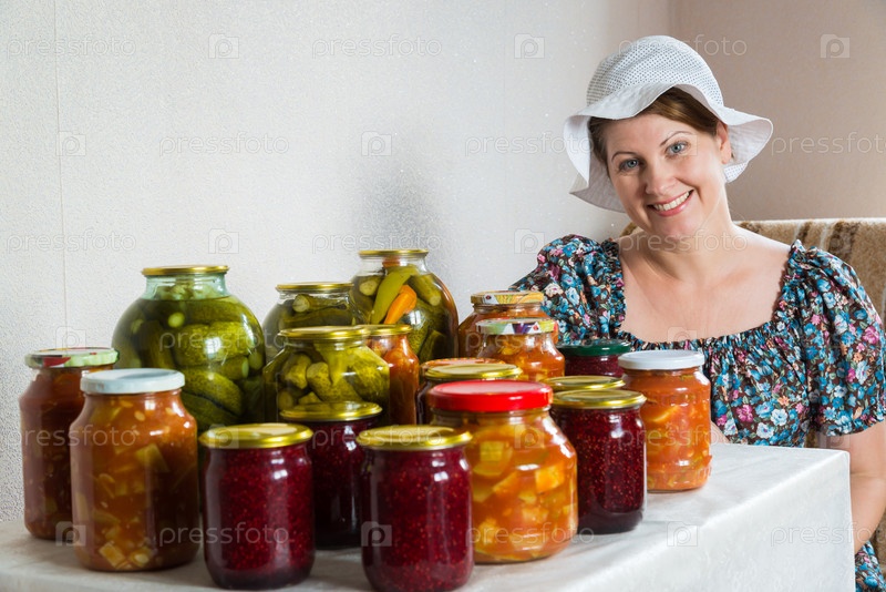 Домохозяйка с консервированными овощами и вареньем