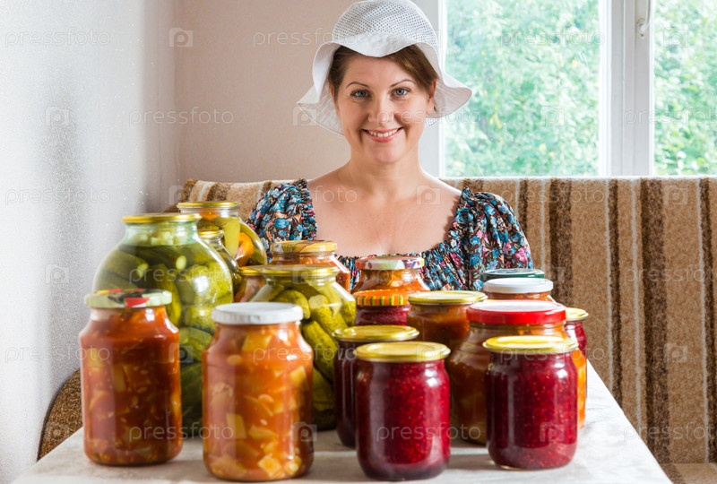 Домохозяйка с консервированными овощами и вареньем