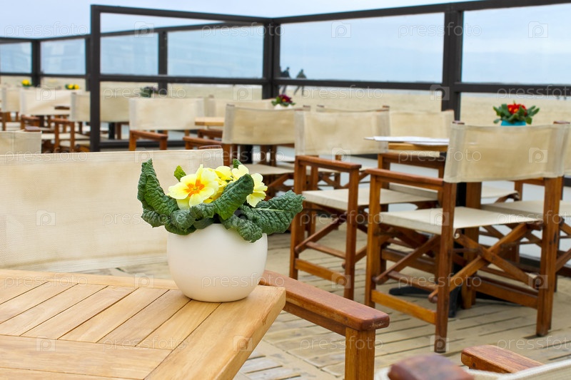 Весна на побережье. Цветы на столе в уличном кафе в Гааге. Нидерланды