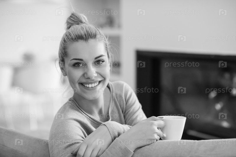 Женщина с кружкой рядом с камином