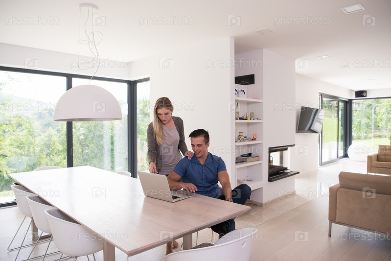 Пара, используя ноутбук дома