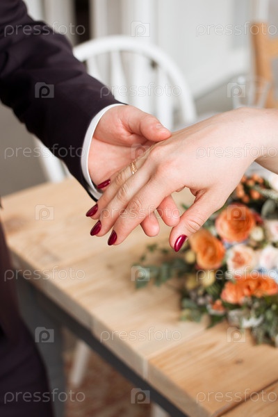 Обручальные кольца и руки невесты и жениха