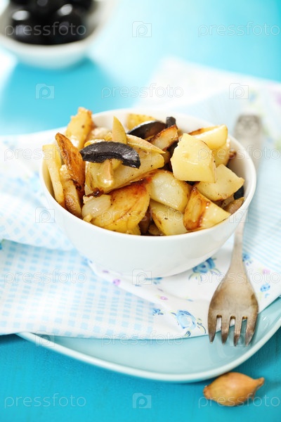 Картофель с маслинами, луком, укропом и оливковым маслом. Селективный фокус
