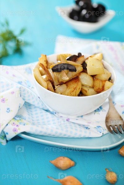 Картофель с маслинами, луком, укропом и оливковым маслом. Селективный фокус