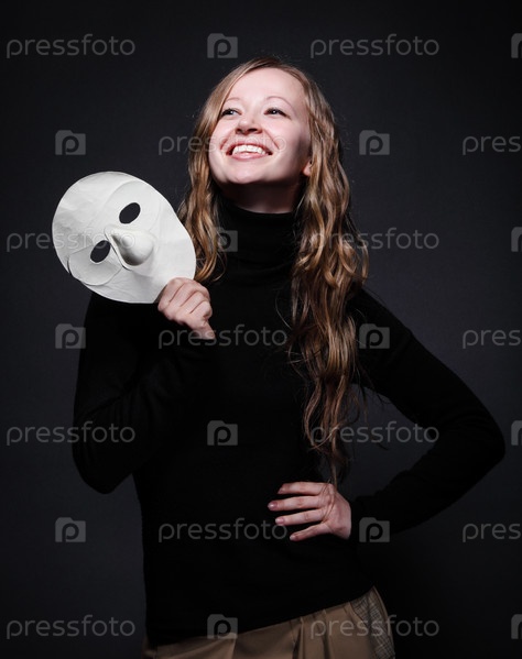 Портрет красивой женщины с длинными волосами, держащей маску