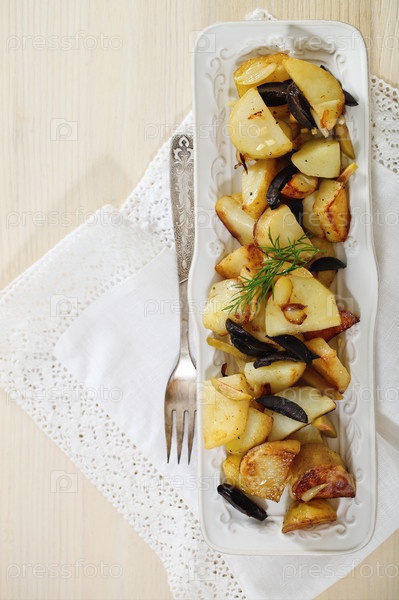 Картофель с маслинами, луком, укропом и оливковым маслом. Селективный фокус