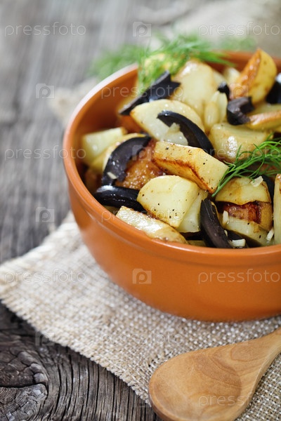 Картофель с маслинами, луком, укропом и оливковым маслом. Селективный фокус