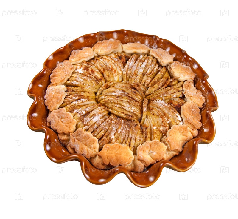 Яблочный пирог с украшениями в форме листьев в форме для выпечки на белом фоне