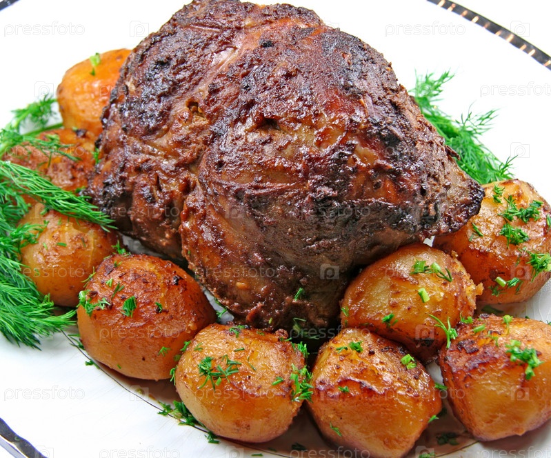 Жареный бараний окорок, картофель и укроп на тарелке