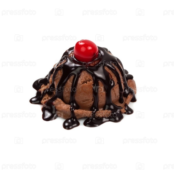 Шоколадное мороженое с сиропе сундэ с вишенкой на белом фоне