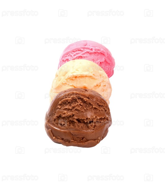 Шоколадное, ванильное и клубничное мороженое в шариках на белом фоне