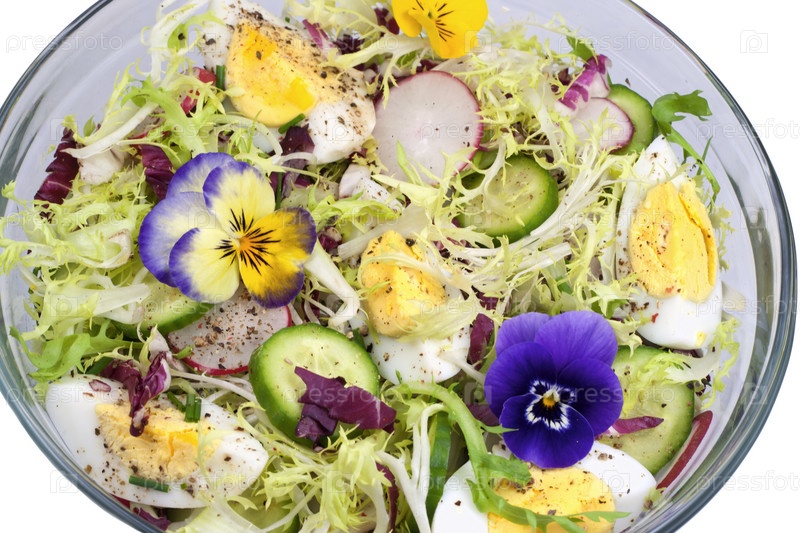 Стеклянная чаша с весенним салатом, украшенным фиалками, на белом фоне