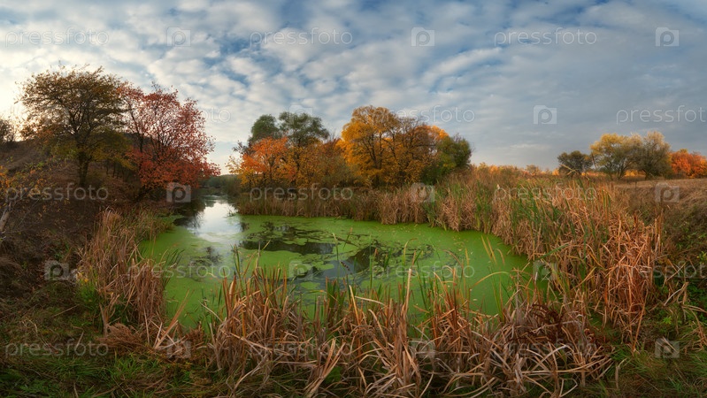 Осенний пейзаж с желтыми деревьями, рекой и облаками на небе