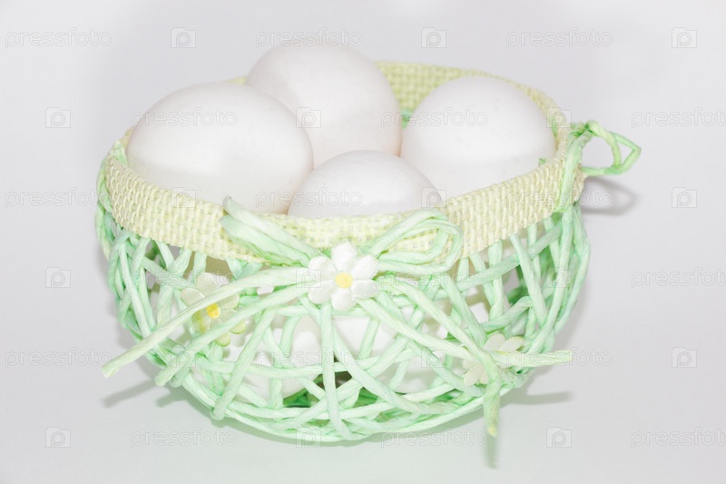 Яйца в зеленой корзине на белом фоне