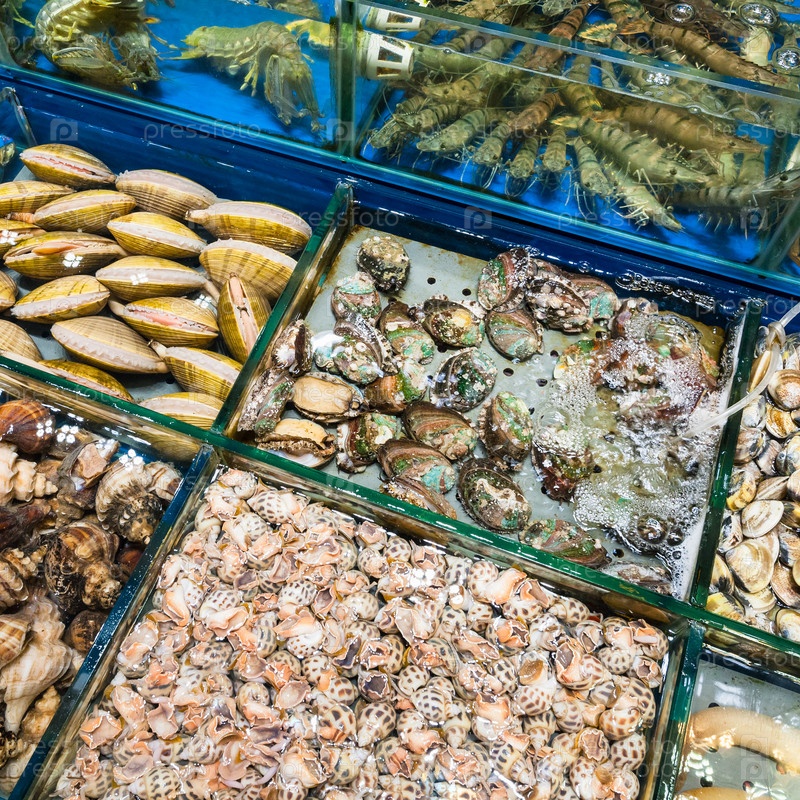 Мидии и креветки на рыбном рынке в городе Гуанчжоу