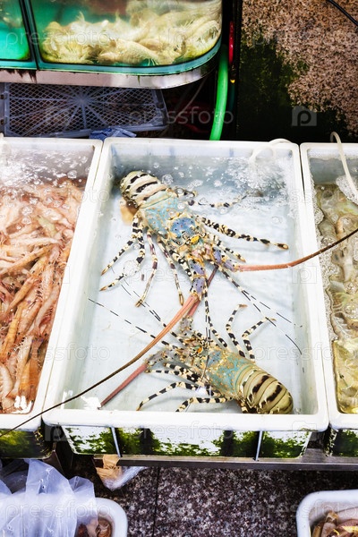 Лангусты на рыбном рынке в городе Гуанчжоу