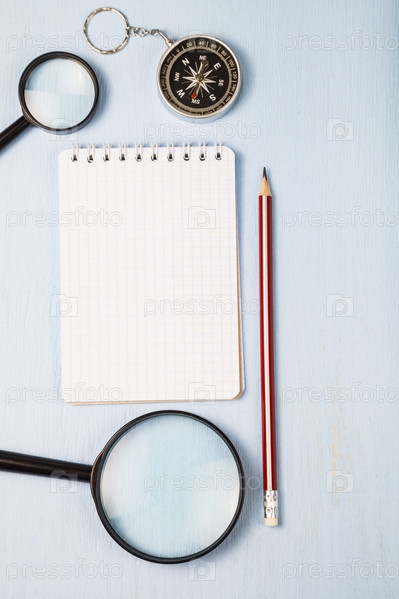Компас, увеличительное стекло и блокнот