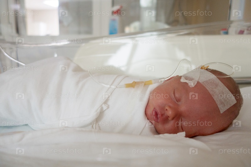 Новорожденный ребенок спит с капельницей
