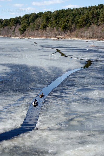 Утка и селезень плывут между льдинами
