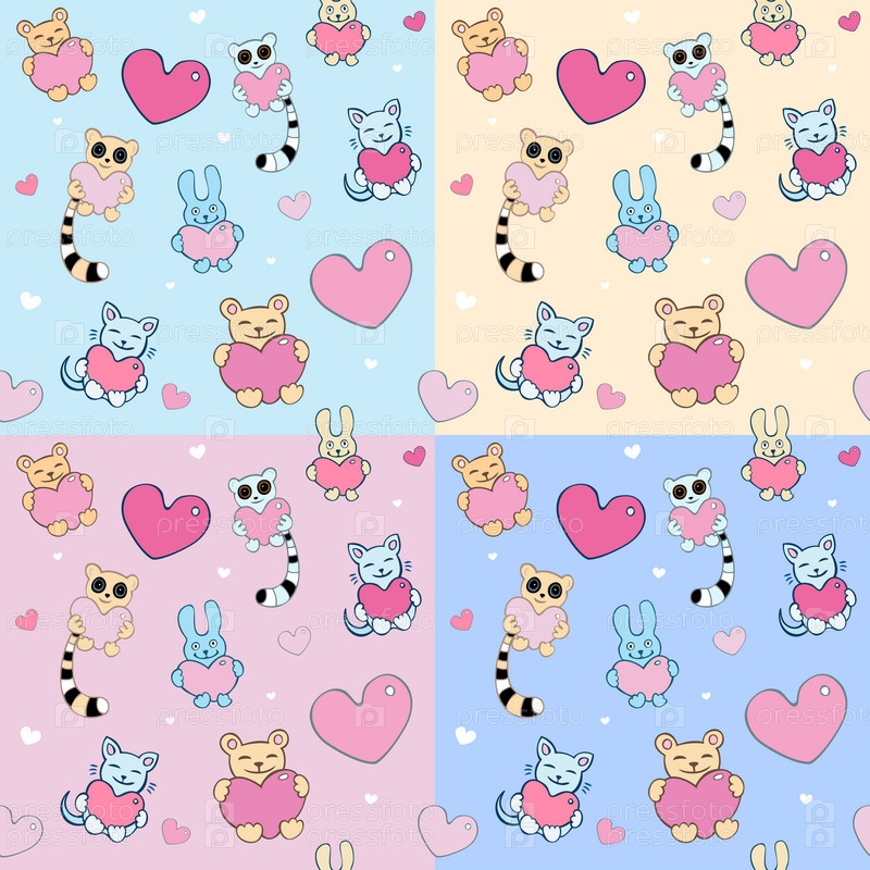Бесшовный фон с мультипликационными кроликами, лемурами, кошками и сердца