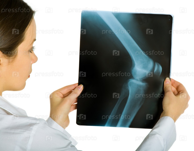 Молодая привлекательная женщина-врач, которая ищет рентгеновские фотографии колена