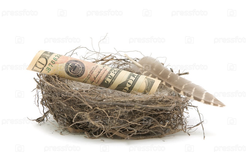 Деньги в птичьем гнезде, изолированном на белом фоне крупным планом