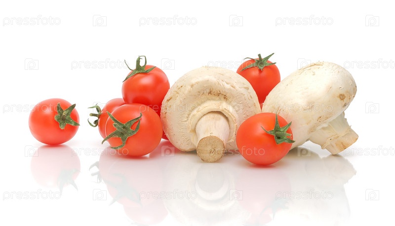 Грибы шампиньоны и спелые помидоры черри крупным планом на белом фоне