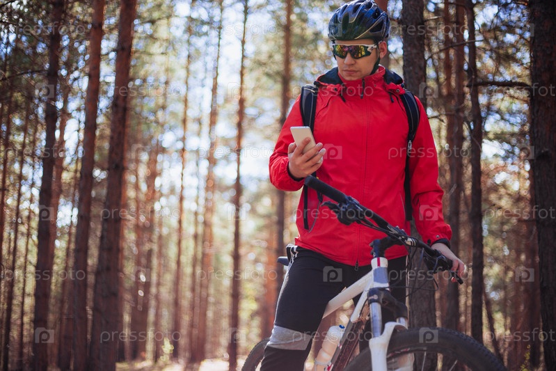 Велосипедист смотрит в телефон в лесу