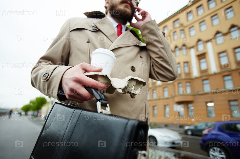 Бизнесмен с кофе и телефоном идет по улице