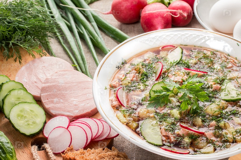 Летний холодный суп с редькой, огурцом и укропом. Окрошка