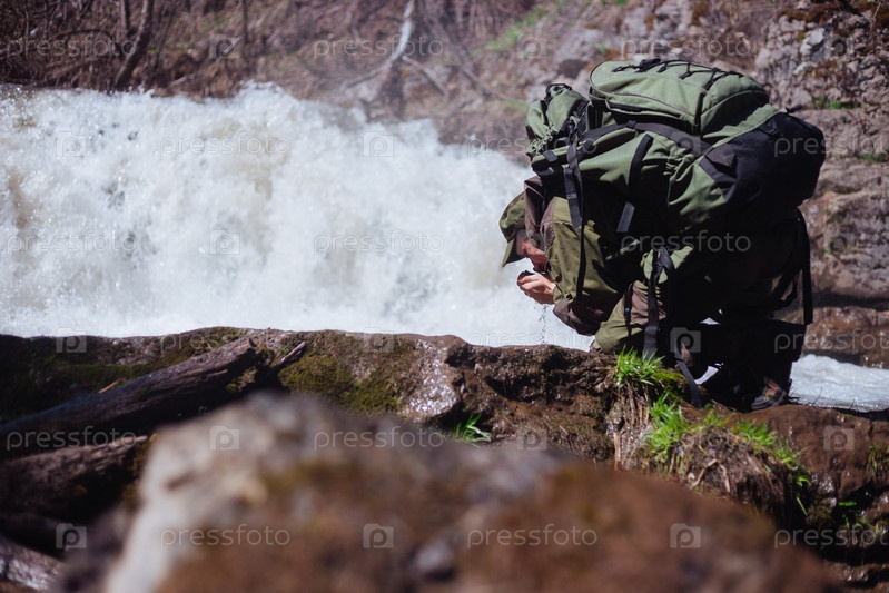 Путешественник пьет воду из реки