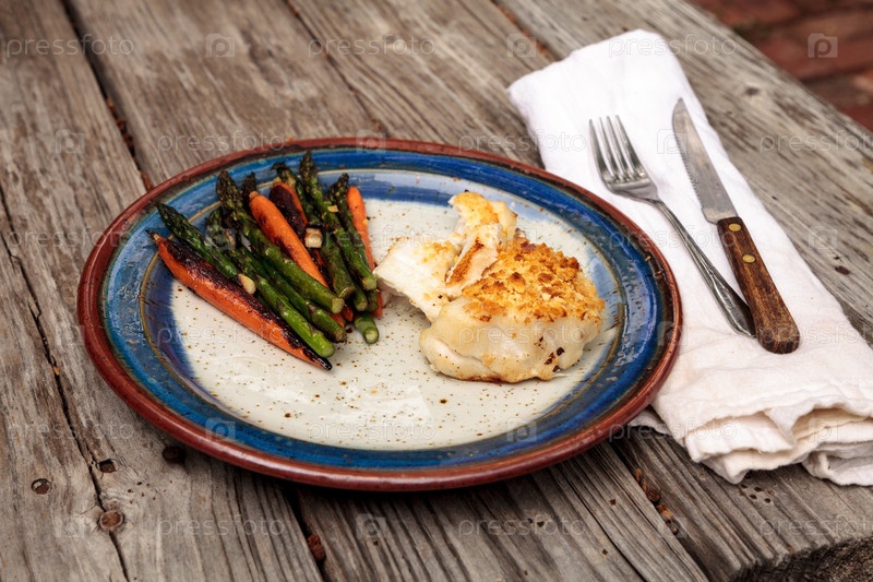 Морского окунь с сухарями и жареной спаржей