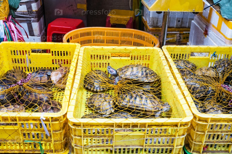 Черепахи в коробках на рыбном рынке в городе Гуанчжоу