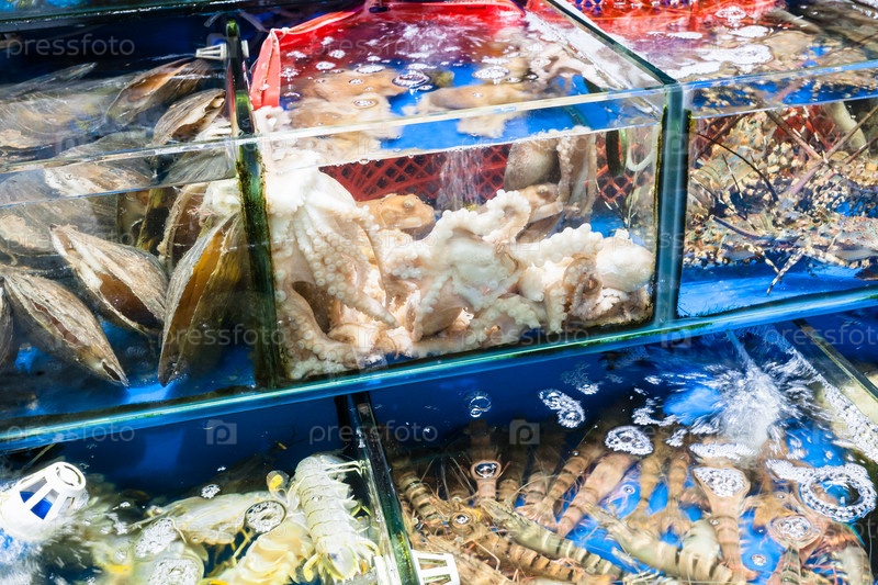 Осьминог, лангустины на рыбном рынке в Гуанчжоу
